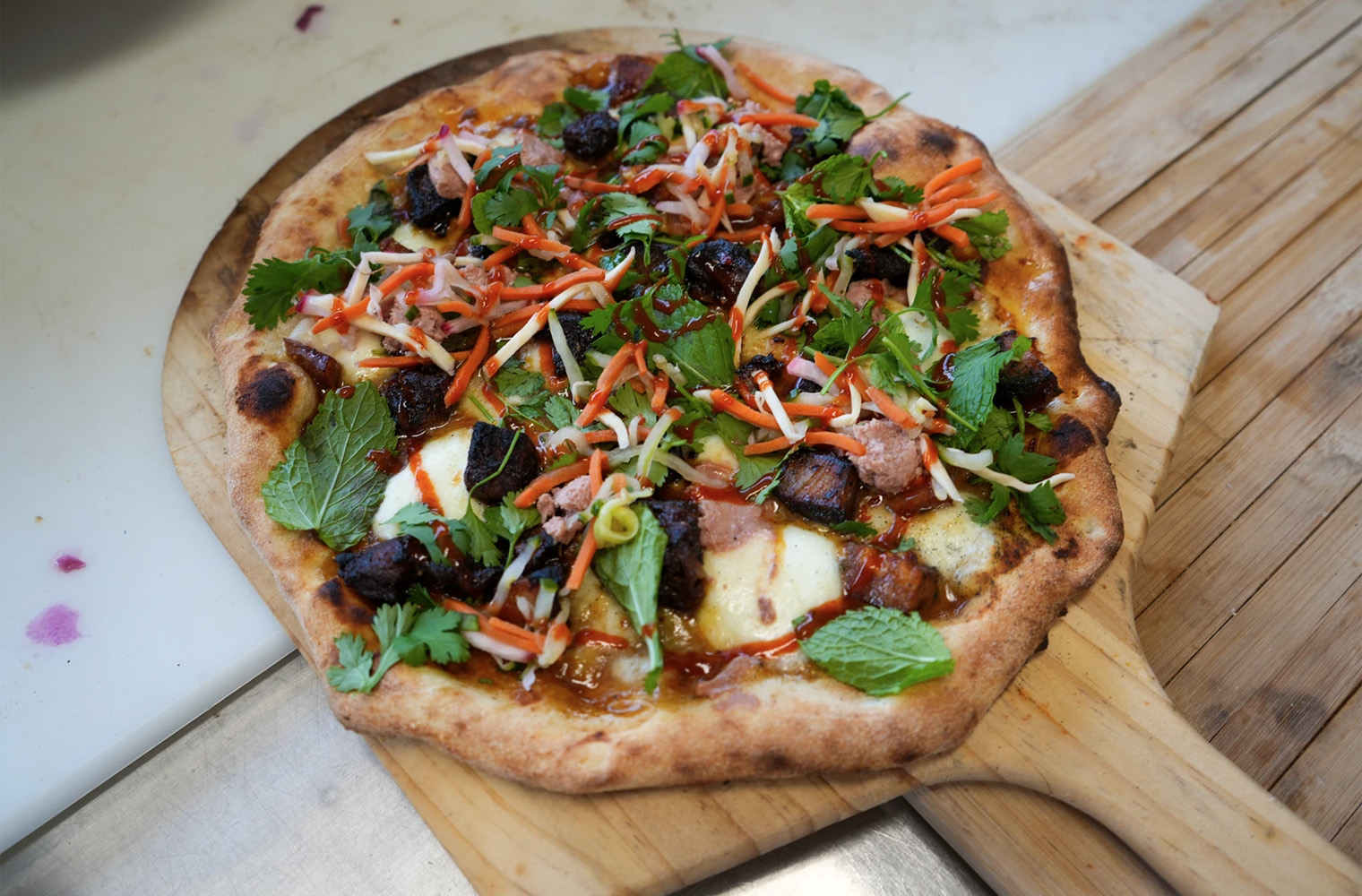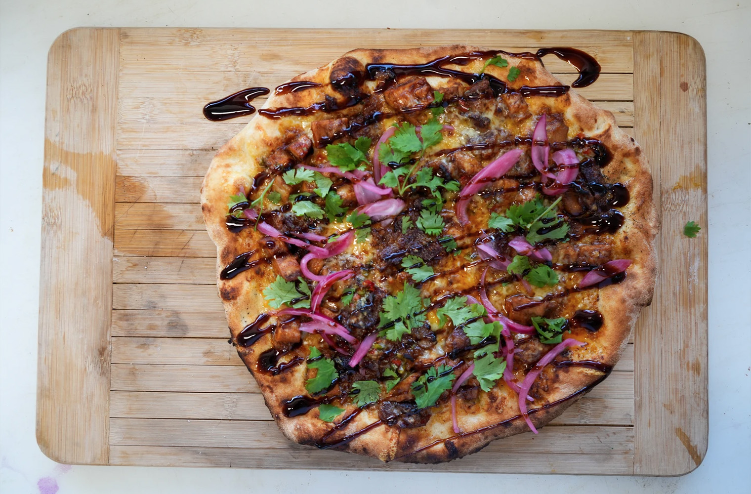 Shredded chicken, applewood smoked bacon, mozzarella cheese, marinated sweet onions, cilantro, finished with BBQ sauce