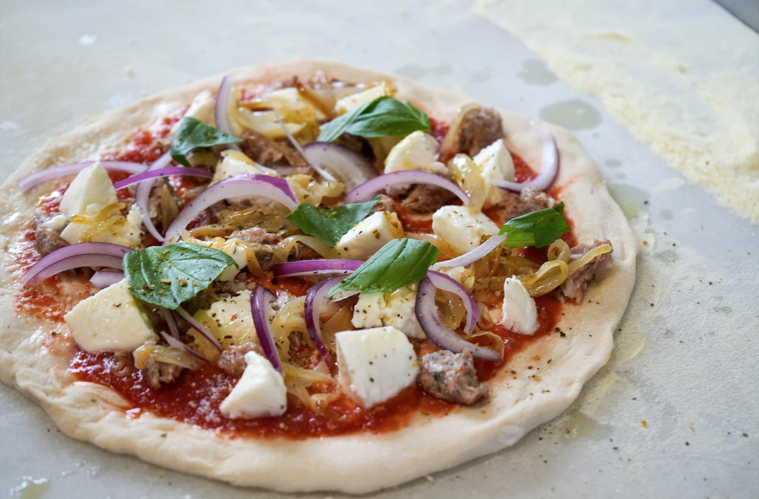 Seasoned tomato sauce, fresh mozzarella pearls, and fresh basil